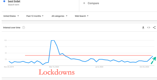 谷歌搜索数据显示,针对“坐浴盆”关键词的搜索量在近来再度攀升,这是自3、4月美国几乎全国封锁以来,该产品再度受到追捧的信号之一。商家同时还推出了可以直接安装在马桶上的冲洗设备,便于安装,售价也只要几十美元左右。几乎所有的浴室设备制造商都上线了类似产品,包括科勒、TOTO等。