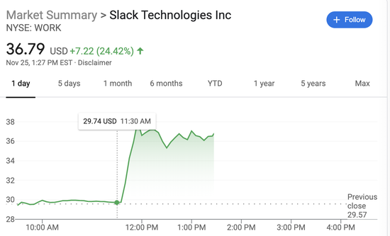 受到消息影响,Slack周三早段股价一度大涨28%;Salesforce则回落3.6%。