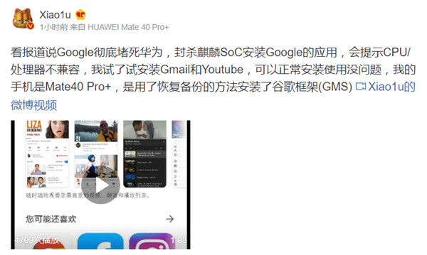 对于这个问题,数码大V@Xiao1u验证了自己的华为Mate40 Pro手机,尝试安装Gmail、Youtube都没问题。