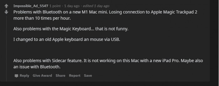 来自国外论坛 Reddit 的用户反馈了大量的此类情况。他们之中有购买了新 MacBook Air 的、MacBook Pro 的,也有购买了新 Mac mini 的,关于蓝牙故障问题时有发生。