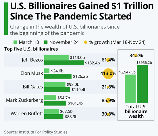 美国亿万富翁们不仅对新冠“免疫”,还在疫情期间不断壮大,集体财富大增。政策研究所(Institute for Policy Studies)的Chuck Collins进行的一项分析发现,自今年3月份以来,美国亿万富翁们的财富增长了1万亿美元,增幅超过34%。