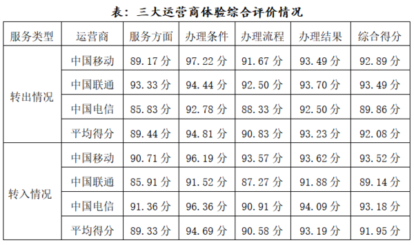 体验调查结果显示,三大运营商的综合评价上,办理转出服务的综合得分排名由高到低依次为:中国联通93.49分,中国移动92.89分,中国电信89.86分;办理转入服务的综合得分排名由高到低依次为:中国移动93.52分,中国电信93.18分,中国联通89.14分。