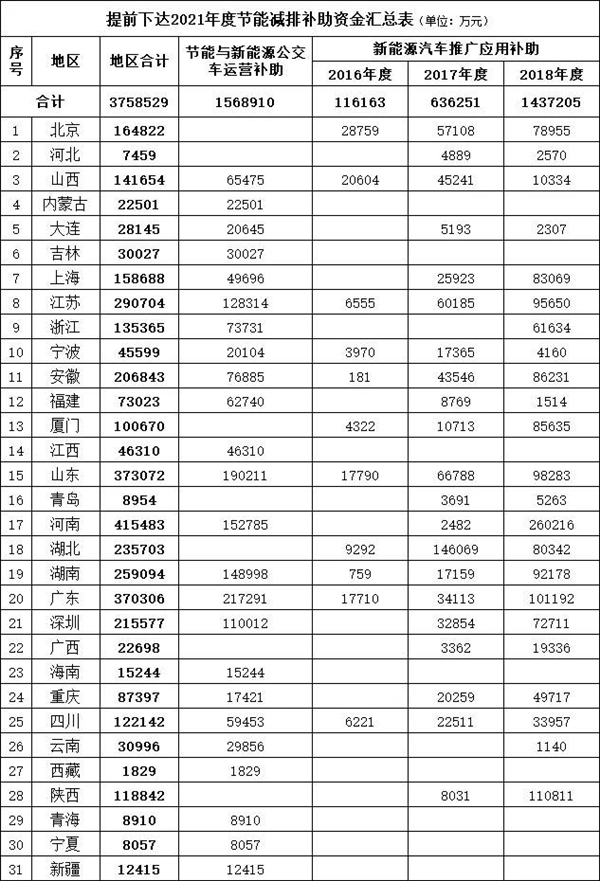 财政部提前下达省(区、市)2021年节能减排补助资金,用于2019年度节能与新能源公交车运营补助资金、2016-2018年度新能源汽车推广应用补助资金清算。2021年共安排新能源汽车补贴375.8529亿元,详细情况如下表:
