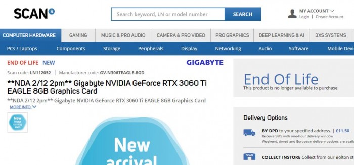 部分零售商已经于上周开始上线 NVIDIA GeForce RTX 3060 Ti 非公版,甚至部分型号开始接受预订。包括亚马逊英国、Scan英国、XtremeMedia(西班牙)、Dateks(拉脱维亚)在内的电商已经罗列了多个 NVIDIA GeForce RTX 3060 Ti 的非公版型号,并公布了零售价格。