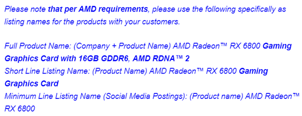 当然,平常里大家就是随便叫了,RX 6800、RX 6800 XT及RX 6900 XT都行了,这个规范只是用于厂商的市场营销宣传。