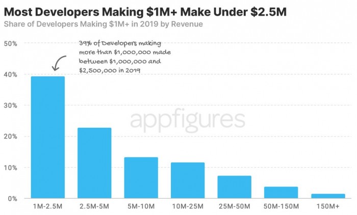 根据应用数据和分析公司 AppFigures 提供的最新数据,这项福利适用于 98% 在 App Store 上赚钱的开发者。该网站指出,目前苹果 App Store 上大约有超过 200 万款应用程序,其中有大约 37.6 万个是付费下载、应用内购或者订阅等模式的收费应用程序。这些收费应用程序来自于 12.45 万位开发者。根据 AppFigures 的应用智能平台,只有不到 2% 的人在 2019 年的实际收入超过了 100 万美元。
