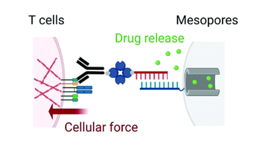 研究人员从多孔的二氧化硅微粒子开始。这些孔隙中充满了抗癌药物,并用双链DNA制成的塞子封住。其想法是,当T细胞与癌细胞接触时,它们会给肿瘤和微粒子一点挤压,从而打破DNA“帽子”,释放药物。