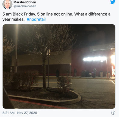 零售业调查公司Coresight Research创始人兼首席执行官德博拉-威斯威格说,她在商店中没有看到与以往一样的长队,消费者对疫情下的购物适应的非常快。沃尔玛没有节日装饰、没有圣诞音乐,人们甚至感受不到黑五已经发生了。一些人也在Twitter上分享了今年黑五的排队情况,在凌晨5点的时候,只有5个人在排队,与往年形成了天壤之别。