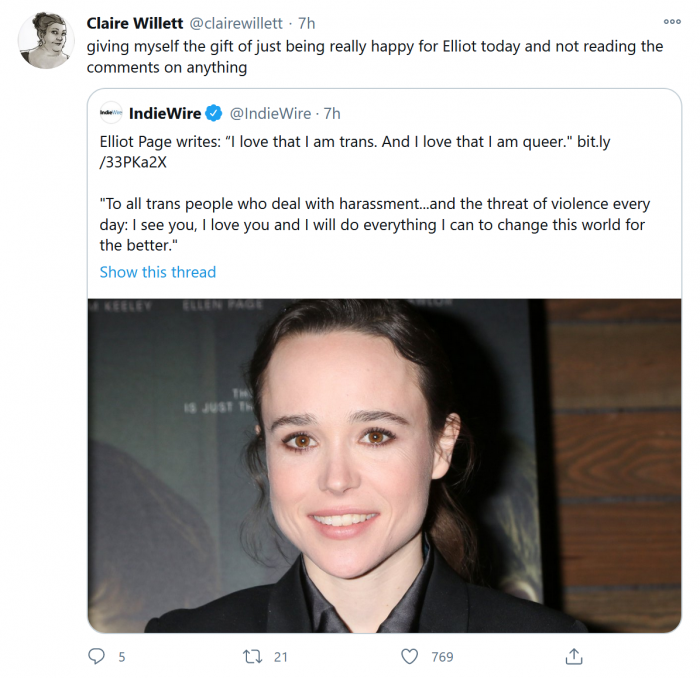Page在社交媒体发布的这一声明上获得了大量支持。前人权运动新闻秘书Charlotte Clymer写道:“Elliot Page……此时此刻,他成为了无数变性人和非二性人的领袖和希望的灯塔,我们感谢他。”