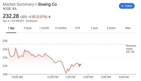 波音股价在午后交易中下跌超过2%,而标准普尔500指数上涨0.7%。