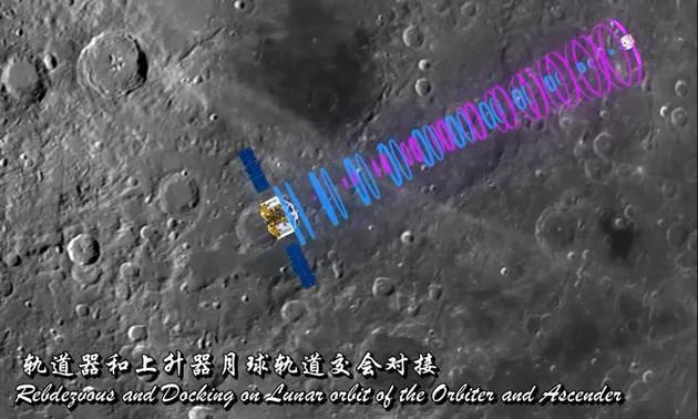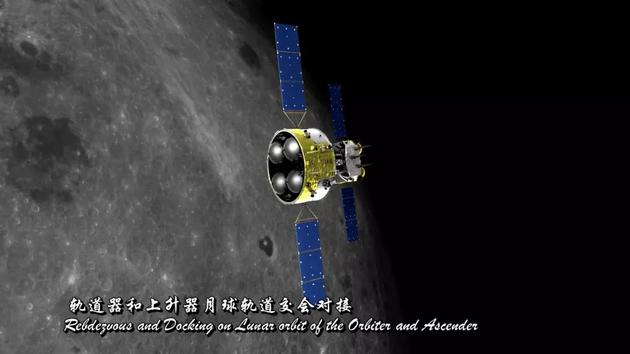 ▲嫦娥五号轨道器和上升器月球轨道交会对接模拟图