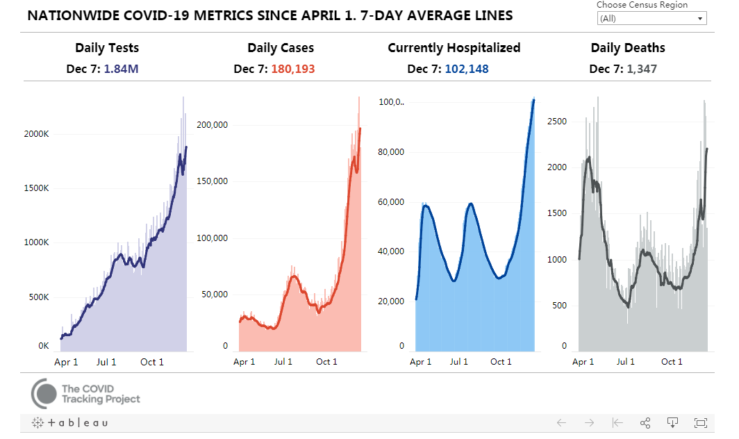 据Covid Tracking data,截止12月7日,美国当日新增确诊病例超18万,7天均值升至近20万水平。衡量医疗系统承受能力的新冠住院人数也创下新高,12月7日达到10.2万。此外重症监护室压力持续增大,全美ICU病人数自大流行以来首次超过2万人。