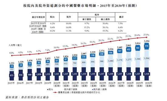 据弗若斯特沙利文报告,2019年中国数字健康市场规模为2180亿元,预计2024年可增至11290亿元,同时医药产品线上渠道销量占院外渠道的比例已从2015年的5%升至10.9%,预计在2030年达到27.5%。