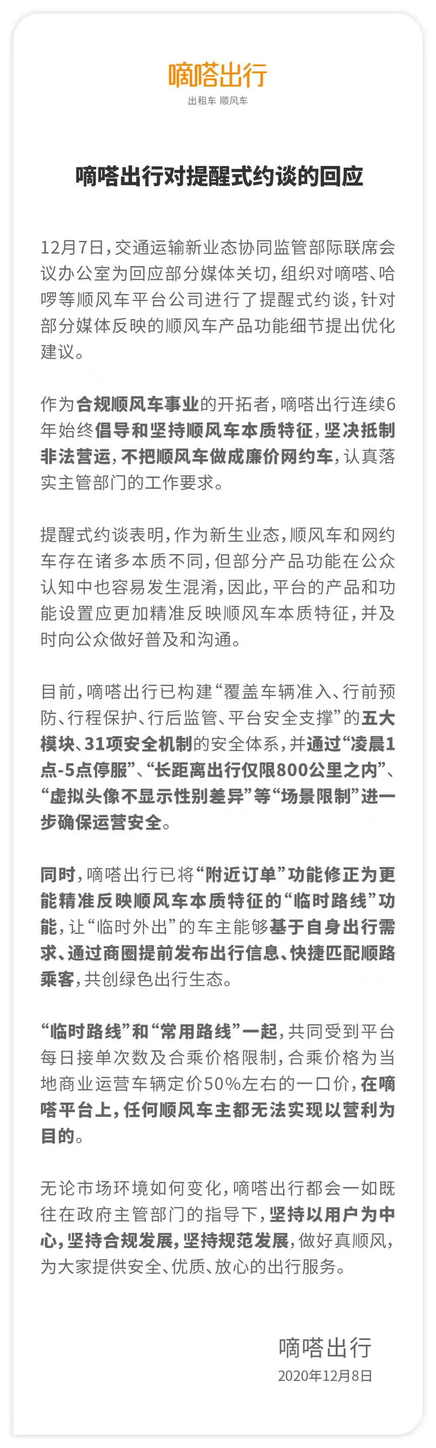 针对约谈一事,嘀嗒出行发布声明称,将坚决抵制非法营运,不把顺风车做成廉价网约车,认真落实主管部门的工作要求。 近日,交通运输新业态协同监管部际联席会议办公室组织对嘀嗒、哈啰等顺风车平台公司进行了提醒式约谈。