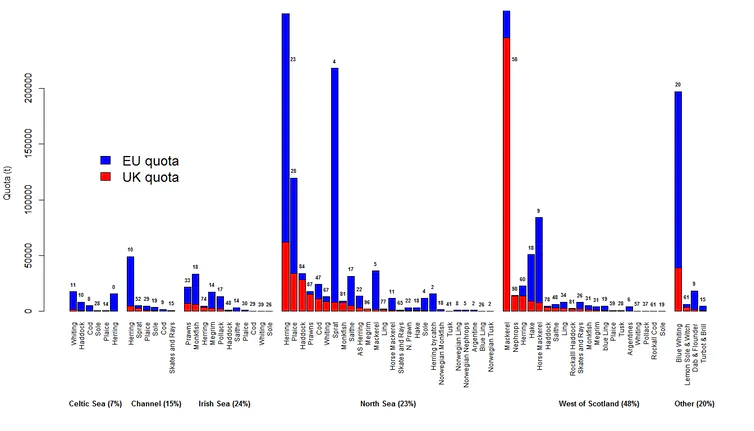 不过,英国获得的各个鱼类品种配额并不相同。例如,2015年,英国获得了北海黑线鳕配额的84%,北海安康鱼配额的81%和苏格兰西部大虾配额的98%;但仅获得了北海鲱鱼配额的4%,北部无须鳕的18%。