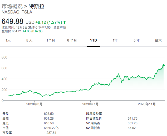 马斯克确实有理由对这50亿美元轻描淡写。今年迄今,特斯拉股价上涨了677%,至本周二收于每股649.88美元,市值超过6110亿美元。上周,特斯拉股票被摩根士丹利列入2021年“长期增长股票”名单。