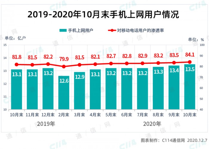 来源于工业和信息化部的数据显示,截至10月末,三家基础电信企业发展手机上网用户数达13.47亿户,对移动电话用户的渗透率为84.1%,较上年末提升1.9个百分点。至此,手机上网用户渗透率出现了新高。