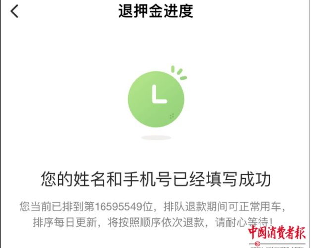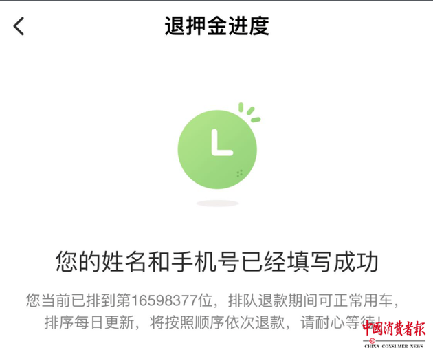 10月10日,《中国消费者报》记者申请退小黄车押金,当时排名:16598377,读作一千六百五十九万八千三百七十七,截图为证: