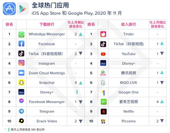 在全球热门应用方面,Disney+ 在被 App Store 以及 Google Play 连续在更多的国家地区推荐后,空降全球下载量榜单第 7 名,收入也表现优秀,继续维持在了收入榜第 4 名的位置,后续值得期待。《爱奇艺视频》挤下 Pandora Music 重新回到收入榜单第 8 名。