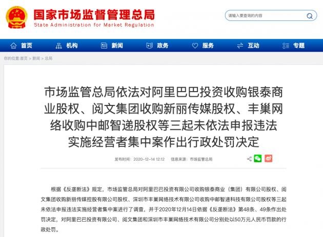 并于2020年12月14日依据《反垄断法》第48条、49条作出处罚决定,对阿里巴巴投资有限公司、阅文集团和深圳市丰巢网络技术有限公司分别处以50万元人民币罚款的行政处罚。