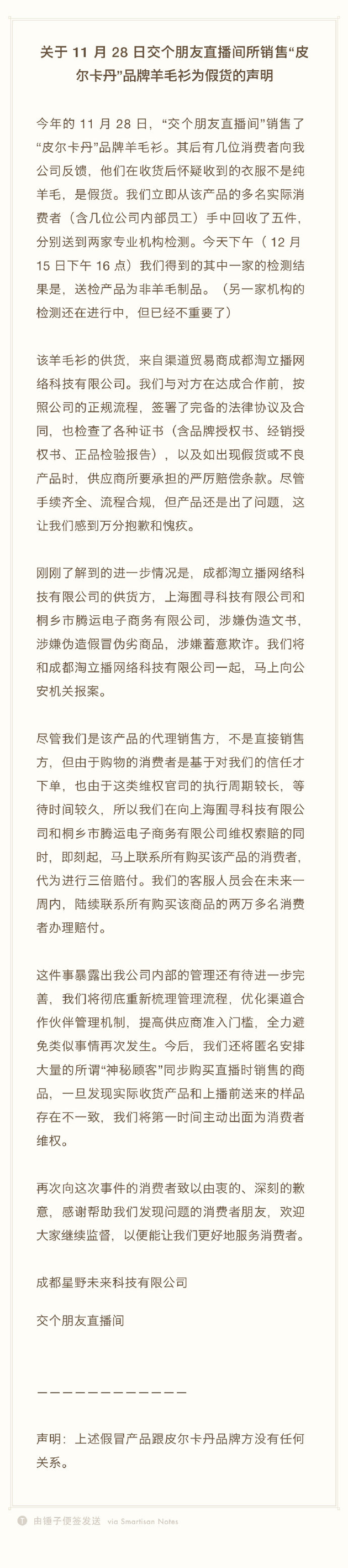 关于11月28日交个朋友直播间所销售“皮尔卡丹”品牌羊毛衫为假货的声明