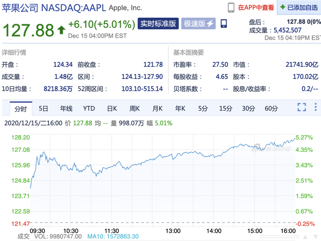 北京时间12月16日凌晨消息,周二收盘,苹果股价大涨5.01%,报127.88美元,创9月份以来的最高水平。此前有报道称,苹果的iPhone 12手机需求强劲,苹果计划2021年上半年生产最高9600万部iPhone,同比增长30%。