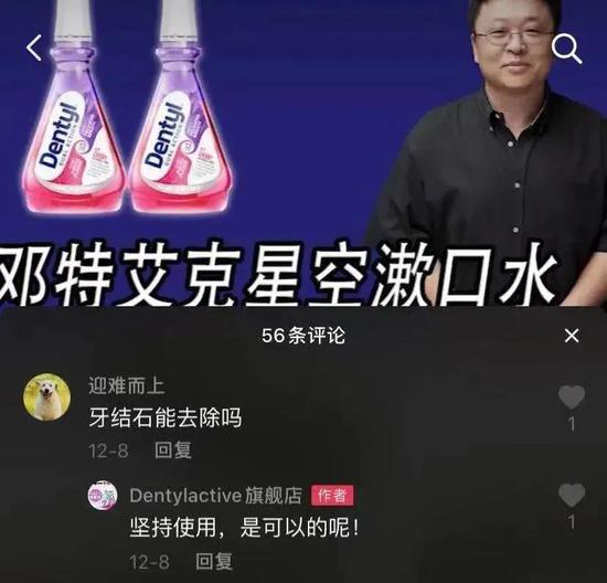 不过,在抖音平台搜索“星空漱口水”时,有一条挂有罗永浩形象的官方旗舰店视频中,有用户留言:“牙结石能去除吗?”官方客服的回答是:“坚持使用,是可以的呢” 。