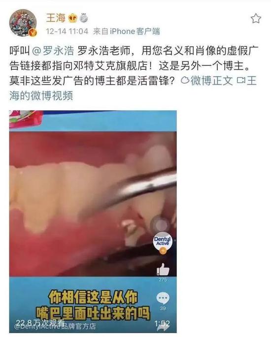 罗永浩发布公告后,记者发现种草姐的该条微博已经被删除,无法确认视频中是否为官方产品链接。在该品牌官方旗舰店中,99.9%抑菌和去牙渍口臭是两大效果,并没有标明有洗牙功能。