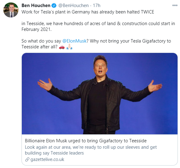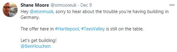 他们已经写信给特斯拉CEO马斯克,邀请他在Hartlepool投资建设一家电动汽车工厂。