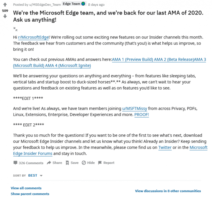 对此在近日在 Reddit 上更新的 AMA 问答中表示,微软目前开发的重心在于统一 Android 和桌面端的代码。在迁移完成之后,微软将会更频繁地更新,并且它将通过支持新Fluent Design元素升级到Chromium 87或更高版本。但是博文中并没有提供具体的时间表,微软表示会在明年公布更多信息。