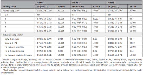 研究人员通过Fine-Gray检验与竞争风险模型评估了健康睡眠评分与心力衰竭发生率之间的关系。结果显示,在随访的10.1年中,共记录了5221例心力衰竭,且健康睡眠得分越高,心力衰竭发生率越低。健康睡眠每增加1分,心力衰竭风险就降低15%。对糖尿病、高血压、药物使用、遗传变异等其他变量进行调整后,该关联并没有显着变化。与健康睡眠评分只有0~1分的参与者相比,评分为5分的参与者发生心力衰竭的风险降低42%。