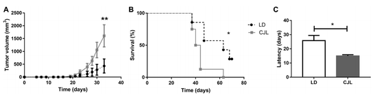 受试组肿瘤生长和动物存活的特征。