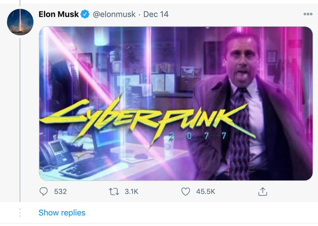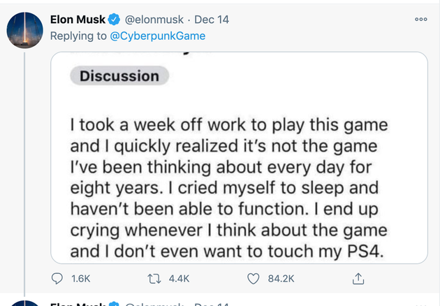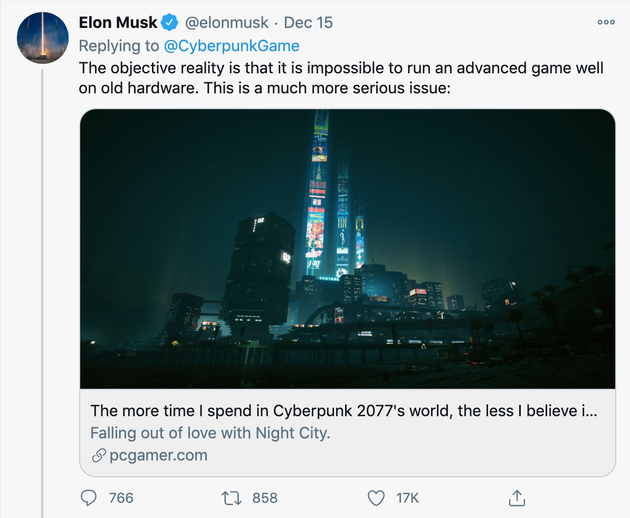 但事实上,这段话并不是马斯克所说,而是他在Twitter上回复《赛博朋克2077》官方账号时,而引用一名Reddit用户的感受而已。