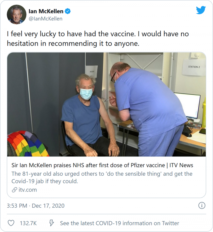 据外媒报道,甘道夫已经被保护了。英国国家卫生服务机构(NHS)在一份新闻稿中宣布,在《指环王》和《霍比特人》三部曲中扮演甘道夫和《X战警》系列电影中的万磁王等角色的演员伊恩·麦克莱恩于当地时间周四接种了他的第一支新冠肺炎疫苗。