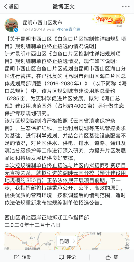 这个时候,网上出现了一些不实传闻,给大家造成了不少困扰。对于这些谣传,昆明市西山区已经正式作出澄清,我们也正式声明:湖畔云南分校项目正在依法依规正常推进,网传的“占地1.9万亩”和“被叫停”都是谣言。