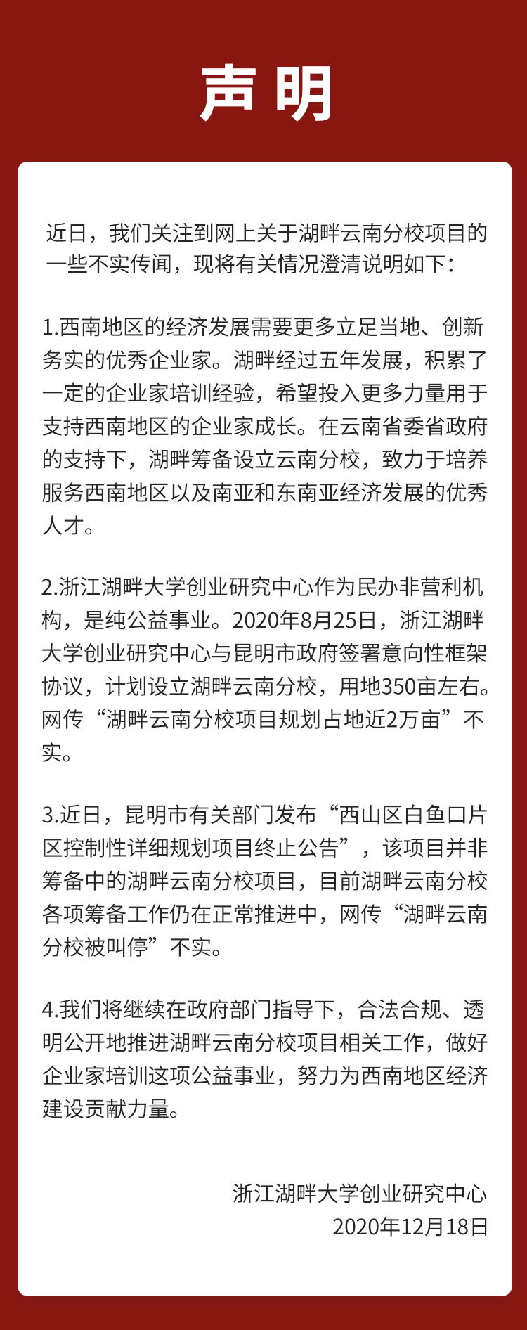 12月18日晚间消息,湖畔大学微信公众号发文表示,近日网上所传“湖畔云南分校被叫停”为假新闻,湖畔云南分校项目正在依法依规正常推进,网传的“占地1.9万亩”和“被叫停”都是谣言。以下为湖畔大学原文: