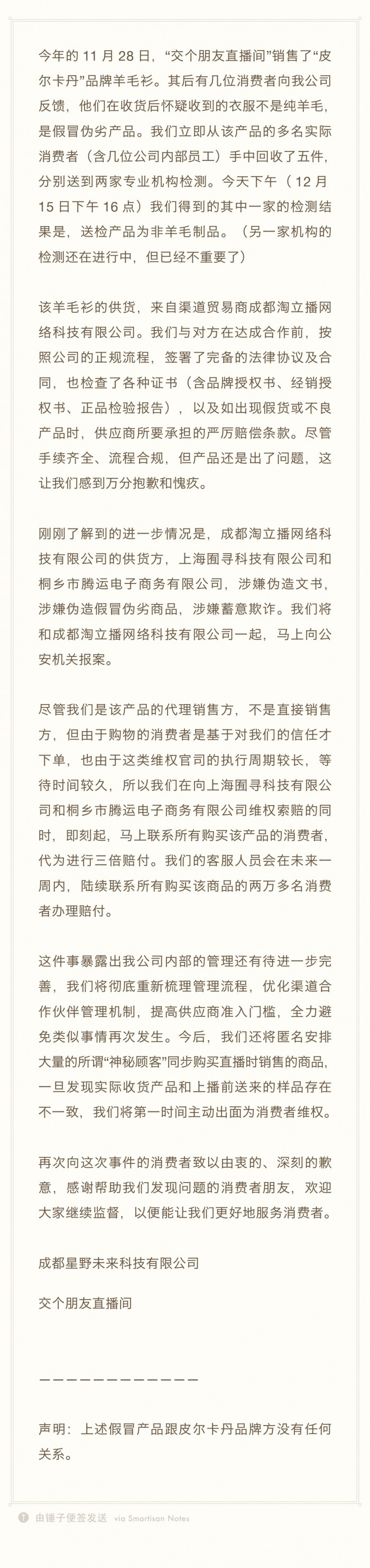 交个朋友公关负责人吴加录表示,因为贸易商伪造文书,皮尔卡丹、交个朋友直播间都成了受害者,消费者也是受害者,但我们主动承担一切责任,全力维护消费者权利。