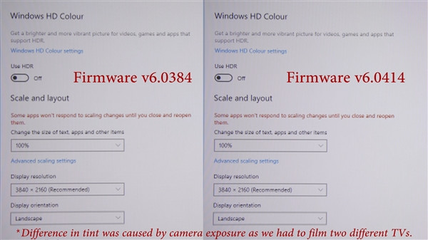 日前,HDTVtest的Vincent Teoh买了两台索尼X900H(美国型号XH90)测试,分别对比索尼新旧固件(v6.0384和v6.0414)下4K 120Hz的画面表现,以观察索尼是否修复。