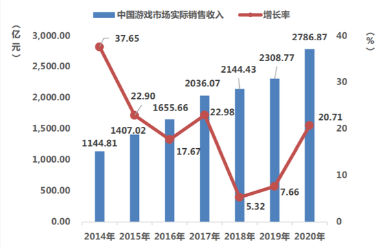 报告显示,2020年,我国的游戏用户规模为6.65亿人,同比增长3.7%,中国游戏市场实际销售收入为2786.87亿元,同比增长20.71%,增速同比提高13.05个百分点,回顾2018年和2019年较低的增长率,今年国内游戏市场可以说重回快速增长期。