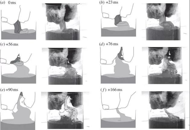 水是如何被舌头带上来的呢?科学家认为,当舌头以一定的速度接触液体并离开的时候,水具有一定的粘性,动量的传递会让一部分水因惯性带离水面,就像汽车刹车的时候会把人甩出去一样。上升过程中因为有重力,水的上升速度不断减慢,只能到达一定高度。在整个作用力分析中,粘滞力和毛细管力可以忽略不计。