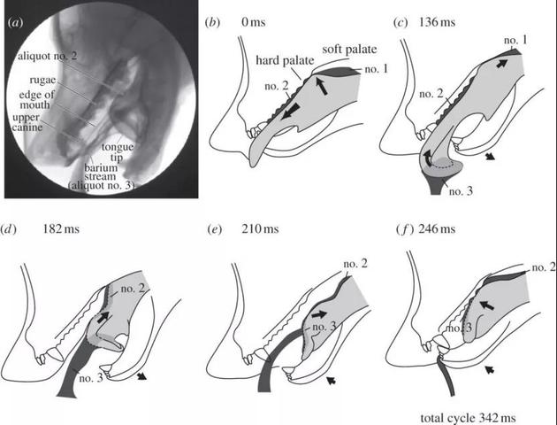 为了更清晰地看到水是如何进入狗口中的,科学家甚至动用了X光机进行拍摄。既然用了X光机,狗喝的水肯定也不是普通的水了,而是混合了钡和奶的混合物。这下可以清晰地看到,狗也是利用惯性,用舌头把水给“引”上来的。
