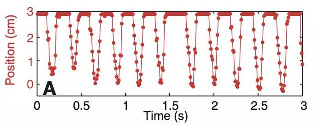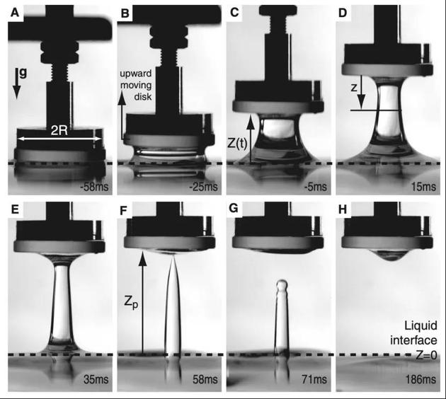 为了验证自己的想法是对的,即猫舔水的频率是由重力和惯性决定的,科学家做了一个模型来复刻舔水瞬间,模型上圆盘的大小和猫舌头接触液面的面积大小一样。这个模型会垂直接触水的表面,通过改变接触面的大小和速度,来观察这两个因素对被带上来的水的体积的影响。