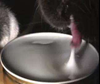 你会发现,在单次舔水的过程中,猫的舌尖并不是伸进液体里把奶舀进嘴里。而是将舌尖卷曲类似于一个平面,然后靠短暂地接触液面,把水稳定“带”到3cm的高度,在水因为重力作用下坠之前,把嘴合上,把滞空的水柱含住。这么反反复复舔11次,便完成了喝水的过程。