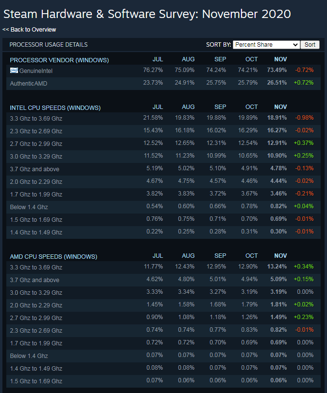 在忍受了英特尔在 PC 处理器市场持续多年的“挤牙膏”式发展之后,下游厂商和消费者开始越来越多地“用脚投票”去支持 AMD 的平台。此外在游戏市场,Steam 平台的 2020 年 11 月硬件调查数据,也给出了类似的结论。最新数据表明,AMD 处理器已在 Windows 平台占据 26.51% 的份额。与此同时,英特尔持续将份额拱手相让,11 月已持续跌至 73.49% 。