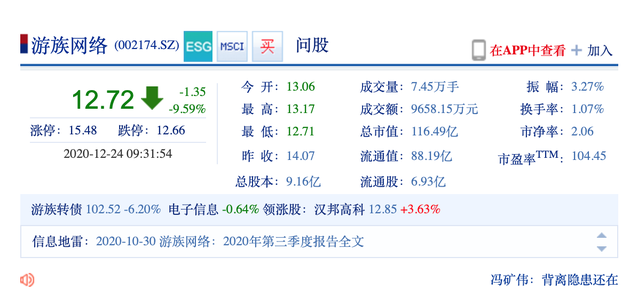 12月24日消息,A股开盘后游族网络下跌超9%,截止9:31,游族网络下跌9.59% 报12.72元,总市值报116.49亿元。12月23日下午,游戏圈内突然传出“游族网络董事长林奇被高层投毒,在ICU抢救后脑干受损”的消息。随后市场还有传闻称,是公司内斗导致投毒事件的发生,且警方已经进入游族网络公司内进行调查。此事瞬间引发热议。