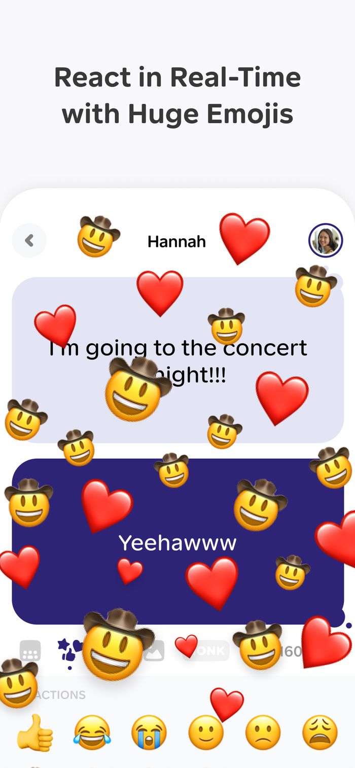 此外,还有发送表情符号、拍照或从相机卷中获取照片在聊天中分享的按钮。这里的表情符号的工作原理更像是iMessage的 "Send with Echo "屏幕效果,因为当你使用这个功能时,你不仅仅是发送一个表情符号,你还发送了几个巨大的表情符号,暂时填满了屏幕。