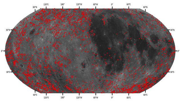 这是迄今最大的月球陨坑数据库,可以自动提取月球中低纬度地区陨坑分布状况。碰撞陨坑形成于流星撞击过程,此类陨坑遍布月球表面。我们可以将月球表面的碰撞陨坑看作是‘化石’,它们记录了太阳系的历史。