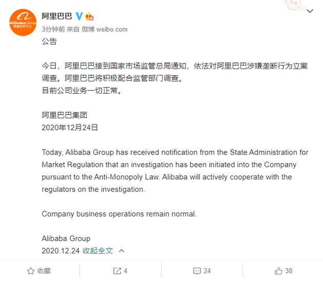 12月24日上午消息,阿里巴巴发布公告表示,今日,阿里巴巴接到国家市场监管总局通知,依法对阿里巴巴涉嫌垄断行为立案调查。阿里巴巴将积极配合监管部门调查。目前公司业务一切正常。
