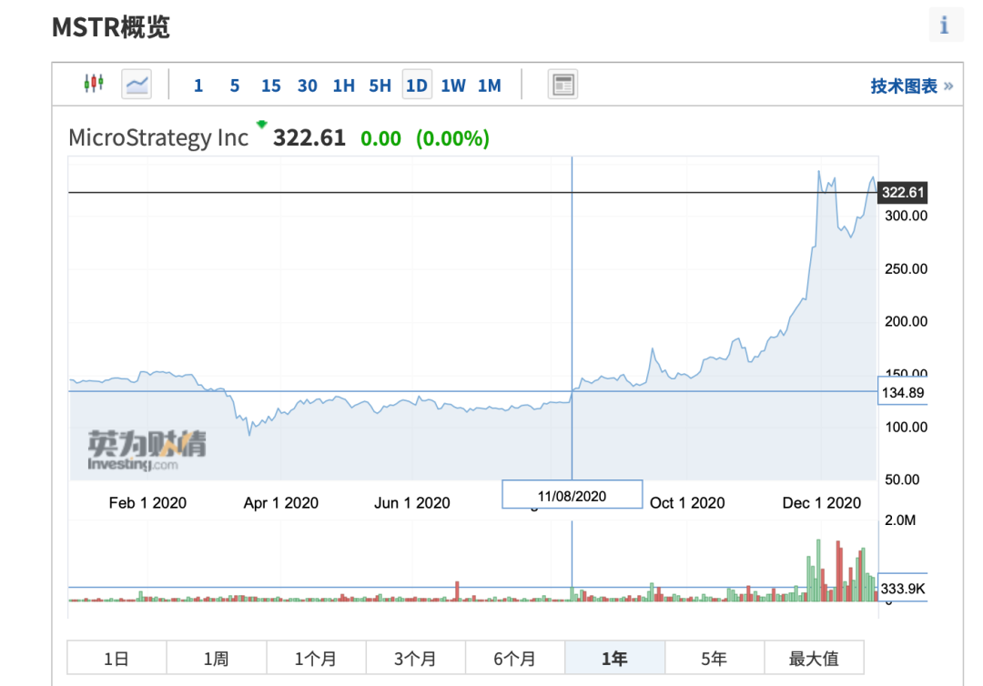 数据显示,MicroStrategy自8月开始大笔购买比特币以来,目前拥有38250BTC(当前价值约6.1亿美元),MicroStrategy已经成为大量持有比特币的机构之一。与此同时,公司的股票交易价格也出现了大幅增长。