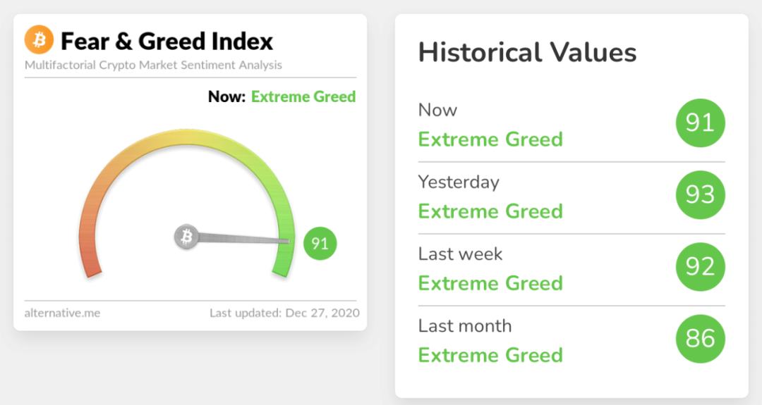 Alternative.me情绪调查显示,12月27日,虚拟货币市场的交易情绪维持“极度贪婪”超一月之久。